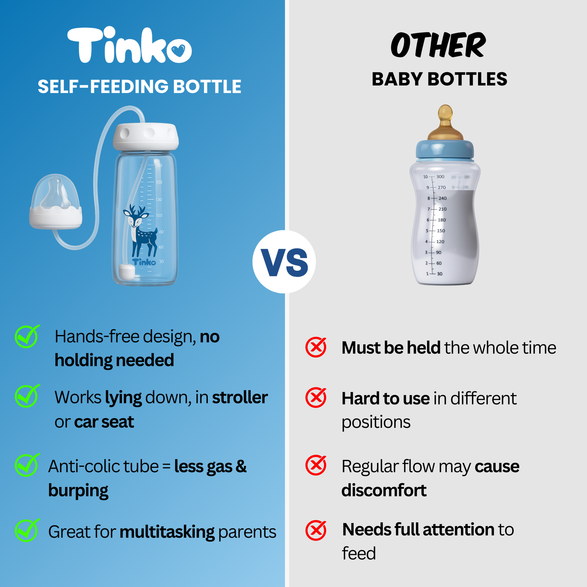 See how Tinko’s self-feeding bottle stands out in comfort, safety, and hands-free convenience compared to regular bottles.